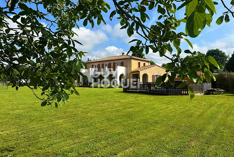 Superbe maison traditionnelle sur un beau terrain plat d'une surface de 3.700 m² dont 900 m² constructible comprenant un hall d'entrée très spacieux 5 chambres en suites dont 2 en RDC superbe cuisine dinatoire équipée et son arrière cuisine vaste salon avec cheminée, bureau, une belle terrasse vue Pyrénées double garage Ses points + : un superbe puits, DPE A, superbe vue dégagée, belles prestations !