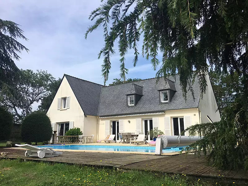 A proximité immédiate de DINAN, dans bourg avec toutes commodités, à l'abri des regards, superbe propriété indépendante et exposée sud-ouest comprenant: au rez-de-chaussée; une belle entrée desservant un grand séjour-salon de 60 m² avec cheminée, une grande cuisine, une chambre avec salle de bains et deux wc, un bureau, une chaufferie. A l'étage, une mezzanine dessert quatre chambres, une salle de bains, un wc et une pièce aménageable. Surface totale habitable de 230 m². Grande terrasse avec piscine de 10 mètres sur 5. Dépendances. Le tout sur un parc exceptionnel clos de murs et arboré de 3 000 m². Environnement exceptionnel. (3.97 % honoraires TTC à la charge de l'acquéreur.)