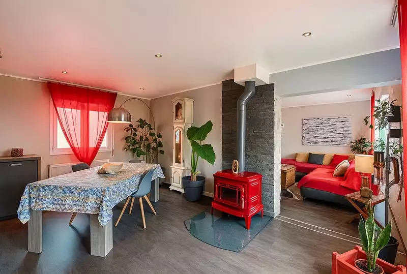 Le rez-de-chaussée propose de beaux volumes lumineux avec un salon et une salle à manger agrémentés d'un poêle à granulés, deux cuisines fermées, une chambre, une salle d'eau moderne et un WC suspendu.