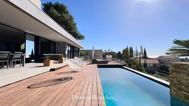 PIERRES-BLANCHES IMMOBILIER - L'EXPRESSION DU LUXE Sète - PBI Collection "À flanc de colline, un rêve suspendu entre ciel et lagune " Sur les hauteurs d'un village ancien, à quelques battements d'ailes de Sète, là où le vent transporte l'odeur des pins et le chant discret des cigales, s'élève une villa rare, posée comme un murmure dans le paysage. Dessinée avec l'élégance sobre de l'architecture contemporaine, cette demeure de 237 m² épouse la pente naturelle du terrain, comme si la terre elle-même l'avait rêvée. Sur une parcelle de 1000 m² bercée par la lumière du Sud, chaque ligne, chaque ouverture semble répondre à l'appel silencieux de l'étang de Thau. Dès le seuil franchi, une sensation : celle d'entrer dans un havre où la lumière danse et le silence s'écoute. Le vaste espace de vie, baigné de clarté, s'ouvre sans retenue vers l'horizon. Ici, la cuisine s'efface dans le décor, le salon dialogue avec le ciel, et la salle à manger s'installe face au paysage, comme un théâtre de lumière. La terrasse en bois exotique déroule ses lames jusqu'à effleurer la piscine suspendue, miroir liquide qui capte les nuances du jour de l'or du matin aux reflets nacrés du crépuscule. Le regard s'échappe vers le Mont Saint-Clair, l'étang, les barques invisibles et les couchers de soleil qui semblent ne jamais vouloir finir. Dans l'aile dédiée aux enfants, trois chambres, trois salles d'eau chacune tournée vers le sud, chacune offerte au bleu du monde. À l'étage, accessible par ascenseur, la suite parentale s'isole comme un promontoire secret. Sa terrasse privée, telle une vigie silencieuse, scrute le large, contemple les saisons, accueille la paix. La villa conjugue le minimalisme des formes et la richesse des matières : bois noble, béton lissé, verre généreux Tout ici respire la maîtrise et la douceur. Les équipements, eux, se font discrets et performants : climatisation réversible, volets motorisés, système de sécurité Rien ne manque, tout est pensé pour une vie douce et fluide. Et lorsque le soir tombe sur la pinède, la maison s'illumine comme un phare apaisé dans la nuit douce du Midi. Notre Avis : Belvédère Végétal® À proximité de Sète, ville portuaire éclectique rehaussée de touches Art déco, ce village médiéval, où se conjuguent remparts et hymne lagunaire, abrite une propriété rare où l'épure des lignes rencontre la lumière du sud. Matériaux choisis, proportions tenues, vues magistrales pour une élégance maîtrisée. "Une Vision Authentique et Contemporaine de l'Immobilier de Luxe." Franck Ballester ® TOUTE INSPIRATION, MODIFICATION, REPRODUCTION EST INTERDIT - REGISTERED TRADEMARK Dossier sur références Contact +33 (0)4 67 70 07 87