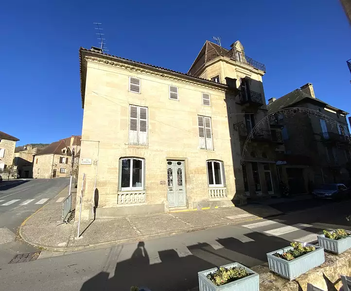 This remarkable property, nestled in the heart of the village, represents a multifaceted real estate opportunity. The ground floor, currently configured for commercial or professional activities and measuring approximately 90 sq m, can easily be transformed into domestic living space. Its current layout allows for a simple and elegant conversion, offering future owners great flexibility in design. The two upper floors, while requiring modernization, have remarkable potential. Currently accessible from the rear courtyard, these levels can regain their historic internal connection by reopening the original staircase, naturally linking the different spaces. On the first floor, there is a large, bright living room with a kitchen, dining area, and laundry room. The top floor, more intimate, accommodates two comfortable bedrooms and a bathroom. Early viewing is highly recommended.