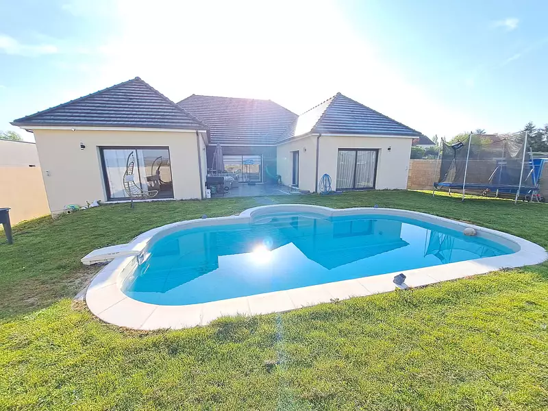 Très proche SENS - Maison d'architecte de plain-pied avec 4 chambres, jardin et piscine La maison d'environ 233 m2, construite avec des matériaux de qualité et proposant de grands volumes, comprend : grande entrée avec placards, vaste salle à manger de 38 m2, salon de 24 m2, cuisine aménagée équipée (avec ilot central en marbre) de 25 m2, couloir desservant trois chambres (environ 15 m2 chacune) avec placards-dressing, salle de bains (avec douche à l'italienne, baignoire à jets et wc), buanderie, ainsi qu'une suite parentale (plus de 22 m2) avec dressing et salle de bains (avec baignoire d’angle balnéo et luminothérapie, douche à l'italienne et wc). Les nombreuses baies vitrées assurent une belle luminosité dans toute la maison. Chauffage par pompe à chaleur gainable (pas de bloc, donc plus discret). Double vitrage. Ballon thermodynamique. Tout à l'égout. Adoucisseur Alarme. Excellente isolation (DPE classé A). Fibre. Vide sanitaire. A l’extérieur, une belle terrasse d'environ 30 m2 orientée plein Sud ouvre sur la piscine chauffée dans le jardin. Eclairage extérieur. Sur un terrain plat, clos de murs, de 774 m2. Au calme. A 3 mn de Sens, proche tous commerces, écoles et gare (moins d'une heure de Paris - direct Paris Bercy).