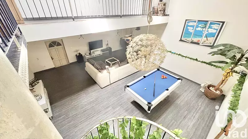 Au rez-de-chaussée, une vaste pièce de vie de plus de 90 m² accueille une cuisine ouverte aménagée et équipée, un espace salle à manger, ainsi qu’un salon cathédrale bénéficiant d’une belle hauteur sous plafond. L’ensemble, largement ouvert et lumineux, propose un cadre de vie chaleureux.