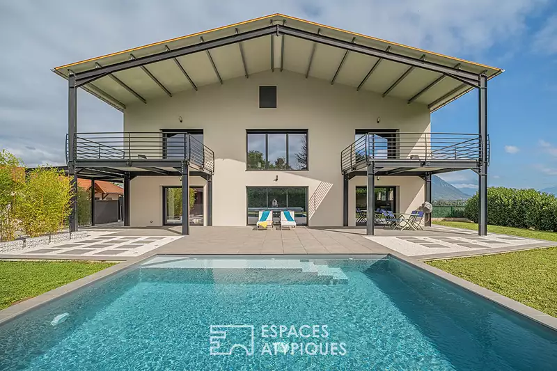 Entièrement dissimulée aux regards, adossée à un quartier résidentiel de Chapareillan, à seulement quelques minutes de Chambery et de son centre historique, cette magnifique propriété de 234m² est une véritable invitation à la douceur de vivre. Un lieu où la modernité rencontre la convivialité, pensé pour conjuguer confort, lumière et art de vivre. En entrant dans la propriété, vous serez séduit par le cadre champêtre et la vue sur les massifs environnants, dont le Mont-blanc d'un côté et le Granier de l'autre, la terrasse couverte qui créent une atmosphère chaleureuse et conviviale. Dès la porte franchie, le regard est happé par la pièce de vie spectaculaire. Près de 82m2 baignés de lumière, sublimés par une charpente métallique apparente associée à la pierre de Maurienne, à la brique et à une hauteur sous plafond impressionnante, lui confèrent une architecture de type industrielle.?Un espace à la fois chaleureux et ouvert, imaginé pour rassembler famille et amis autour d'une cuisine conviviale, entièrement ouverte sur le séjour. Des baies vitrées généreuses ouvrent sur la terrasse, la piscine et le jardin paysager, offrant une vue totalement dégagée sans vis-à-vis. Un espace vestiaire dédié, des toilettes indépendantes ainsi qu'une suite amicale ou parentale avec salle d'eau complètent ce niveau. Cellier et buanderie apportent une touche de fonctionnalité supplémentaire. Au fil d'un escalier à clair-voie, la maison se dévoile encore davantage. L'espace mezzanine, moderne et lumineux, est un atout supplémentaire de cette maison. Cette coursive aux larges baies ouvre le regard sur la nature environnante et dessert 3 chambres aux dimensions généreuses dont deux ont un accès à une terrasse confortable et couverte. A ce même étage, deux wc et deux salles d'eau indépendantes dont une spacieuse et originale est prolongée par un espace lingerie et un grand dressing fermé. A l'extérieur, vous serez charmé par le terrain de 989 m², la piscine chauffée aux abords de la belle terrasse et leur accessibilité depuis la pièce de vie, afin de profiter d'un doux réveil et des soirées ensoleillées. Le jardin, soigneusement entretenu et clos, offre suffisamment d'espace pour laisser libre cours à votre créativité : potager, espace de jeux pour enfants, ou simplement un coin détente pour apprécier la tranquillité de la campagne. Cette propriété, construite en 2020, propose une entrée sécurisée par portail électrique et un garage double aménagé pour créer des zones de stockage et de bricolage. La qualité des matériaux, le soin des finitions et la consommation énergétique vertueuse finiront de vous séduire. La situation de cette maison est également un atout majeur. Chapareillan, avec son ambiance paisible et authentique agrémenté des services de santé, écoles, équipements sportifs et commerces, vous permet de profiter d'un cadre de vie agréable, tout en étant à proximité immédiate de Chambéry et de Grenoble. De plus, les nombreux sentiers de randonnée et espaces naturels environnants vous offriront des occasions idéales pour des promenades en pleine nature. Bien soumis au statut de la copropriété : 11 lots Charges annuelles : 684,48 euros - Pas de procédure en cours. Taxe foncière : 1 358 euros CLASSE ENERGIE : B / CLASSE CLIMAT : A. Montant moyen estimé des dépenses annuelles d'énergie pour un usage standard, établi à partir des prix de l'énergie de l'année 2021 : entre 1 060 euros et 1 500 euros. Les informations sur les risques auxquels ce bien est exposé sont disponibles sur le site Géorisques : www.georisques.gouv.fr Contact : Marie-Laure MAVIC (EI) - 06 84 97 46 73 Agent commercial indépendant RSAC Grenoble n° 890 478 670 Copropriété de 11 lots - dont 11 lots habitation. (Pas de procédure en cours). Charges annuelles : 615 euros. Marie-Laure MAVIC (EI) Agent Commercial - Numéro RSAC : 890478670 - GRENOBLE.