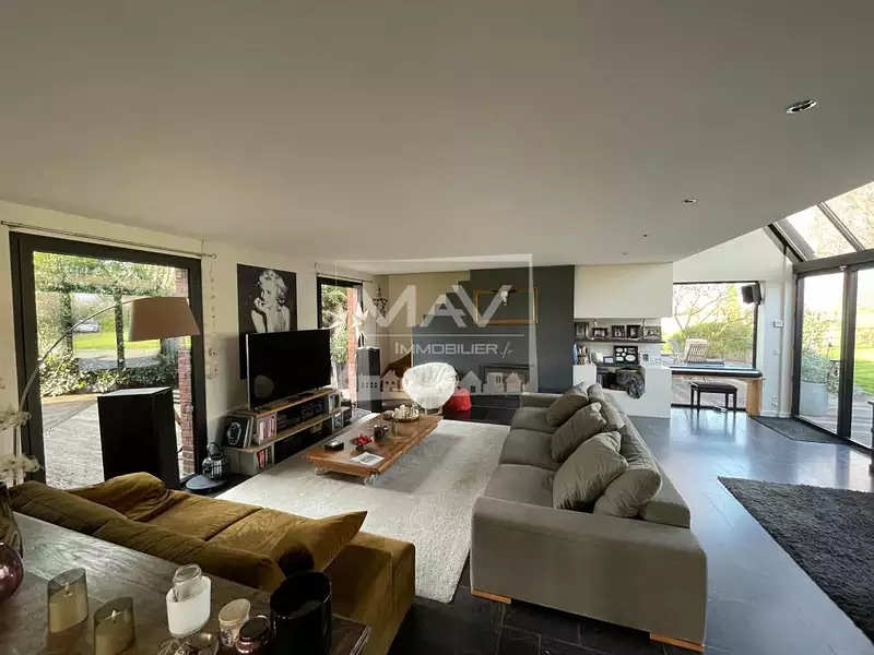 À deux pas de toutes les commodités, dans un environnement préservé avec vue imprenable sur la campagne, découvrez cette superbe maison atypique alliant avec subtilité le charme de l'ancien et l'élégance contemporaine. Pensée comme un véritable lieu de vie, la maison s'ouvre sur différentes ambiances de jardin, créant des univers extérieurs distincts, intimistes et parfaitement intégrés à l'architecture. Les volumes sont remarquables, les perspectives nombreuses, et chaque espace intérieur dialogue harmonieusement avec l'extérieur. La superbe pièce de vie, chaleureuse et spectaculaire, accueille un poêle à bois ainsi qu'une cheminée feu de bois, offrant une atmosphère unique pour les amoureux de moments partagés en famille ou entre amis. Les larges ouvertures prolongent naturellement les espaces vers un grand jardin sans vis-à-vis, avec une vue à perte de vue sur la campagne. La maison propose quatre chambres, dont un magnifique coin parents bénéficiant d'une ouverture sur le ciel, véritable cocon intimiste. Une salle de bain et une salle de douche complètent l'espace nuit. Les prestations sont à la hauteur : chauffage par le sol, poêle à granulés, finitions soignées. À l'extérieur, de nombreux stationnements, un très grand garage, un carport et une cave viennent parfaire l'ensemble. Aucun travaux à prévoir. Un lieu rare, à la fois inspirant et apaisant, offrant un cadre de vie idyllique entre nature et proximité urbaine.