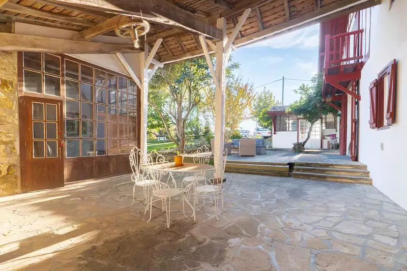 À 25 minutes de Bayonne, dans un environnement calme et verdoyant, cette ferme basque rénovée de 235 m² offre 4 chambres, un vaste séjour, une piscine chauffée et de nombreuses dépendances.