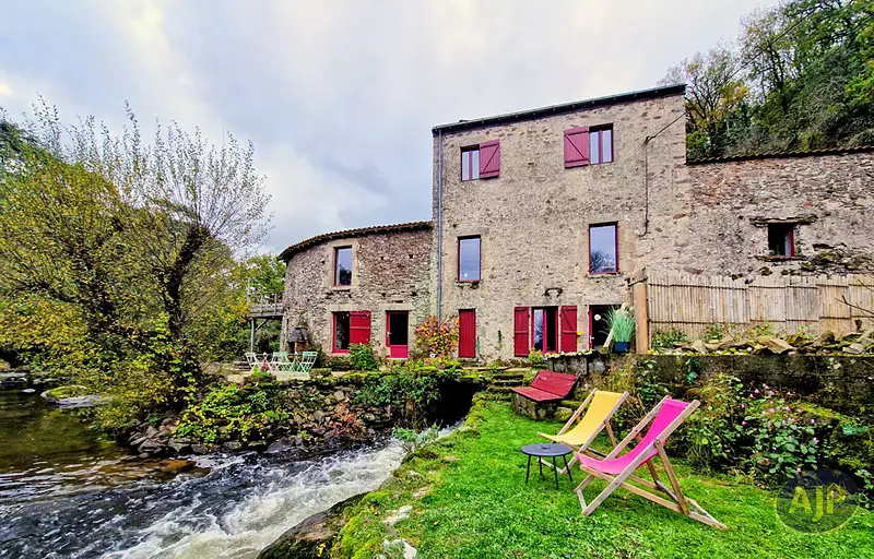 A 12 mn de Clisson la belle cité médiévale (et 4 mn de la gare de Boussay) l, nous vous proposons ce magnifique Moulin du 16ème siècle niché secrètement au fond d'un chemin privé et posé sur l'eau ! Entièrement rénové avec goût avec des matériaux de belles qualités, vous serez séduit par ses 9 pièces réparties sur 235 m2 habitables . Au 1er niveau vous avez l'habitation principale sur 170 m2 environ : une cuisine / salle à manger de 55 m2 avec un coin bureau vue sur l'eau et un salon ( avec poêle à bois) de 50 m2 env ouvert sur une terrasse de 18 m2 sur pilotis qui surplombe la Sèvre ! Des fenêtres comme des tableaux ouverts sur l'eau, vous profitez de cette vue de presque toutes les pièces. Une chambre de 15 m2 , une arrière cuisine buanderie et des WC complètent ce 1er niveau. A l'étage, un palier dessert 3 chambres ( dont une avec dressing), et une salle de bain avec WC. Une 1ere surprise est un accès direct de l'habitation, à un gîte *** refait à neuf, avec une décoration cosy et fonctionnelle, composé d'une pièce de vie avec cuisine, d'une salle d'eau et à l'étage d'une chambre et d'un bureau. Avec une belle rentabilité locative pour ce gîte, un vrai plus pour ceux qui souhaitent faire de la location de vacances ou recevoir amis et famille. Au rez de jardin, 3 caves dont deux aménagées en espaces de vie ( salon et espace jacuzzi pour la seconde). Le Moulin dispose d'un espace avec au moins 4 places de stationnements, d'un jardin et d'une terrasse donnant directement sur la Sèvre pour se ressourcer les pieds dans l'eau aux beaux jours. Un bijou dans un écrin de verdure sauvage pour les amoureux de la nature, un bien aussi rare qu'exceptionnel. Contacter Corinne au 07 83 42 71 92 (5.05 % honoraires TTC à la charge de l'acquéreur.)