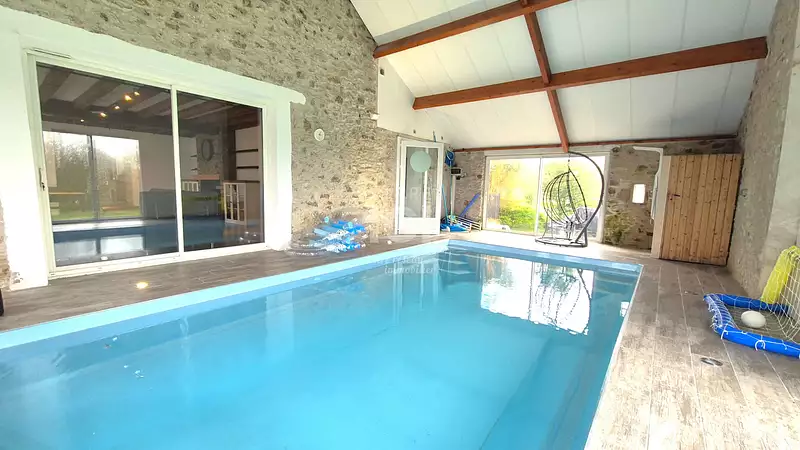 Dans un environnement préservé et verdoyant, cette magnifique longère de caractère vous ouvre ses portes. Entièrement rénovée avec goût, elle incarne le parfait équilibre entre authenticité et confort moderne. Dès l'entrée, vous serez séduit par une atmosphère chaleureuse et baignée de lumière, portée par de beaux volumes et des matériaux de qualité. L'espace de vie principal s'étend sur plus de 65 m², composé d'un vaste salon-séjour traversant exposé plein sud, prolongé par une cuisine ouverte, entièrement aménagée et équipée. Une cheminée éthanol vient sublimer cet espace, idéal pour des instants de convivialité. En rez-de-chaussée, une chambre élégante et une salle d'eau moderne assurent une vie de plain-pied, tandis qu'une salle de jeux et une arrière-cuisine complètent les prestations fonctionnelles de cette maison pensée pour le quotidien. A l'étage, la suite parentale vous offre un confort d'exception avec dressing intégré et salle de bains privative. Trois autres chambres viennent compléter l'espace nuit, accompagnées d'une seconde salle d'eau. L'ensemble développe une surface habitable de 235 m² sur un terrain d'exception de plus de 17 000 m², agrémenté d'un jardin intime de 1 600 m² et d'une grande terrasse ensoleillée de 150 m². La propriété dispose également d'une piscine carrelée, de plusieurs places de stationnement, et d'un système de chauffage performant par géothermie, garantissant à la fois confort thermique et sobriété énergétique. Cette propriété rare, pleine de charme et de potentiel, est proposée au prix de 571 650 euros FAI. Une opportunité à saisir pour les amoureux d'espace, de nature et de caractère. N'hésitez pas à nous contacter pour toute demande d'informations supplémentaires ! (3.00 % honoraires TTC à la charge de l'acquéreur.)