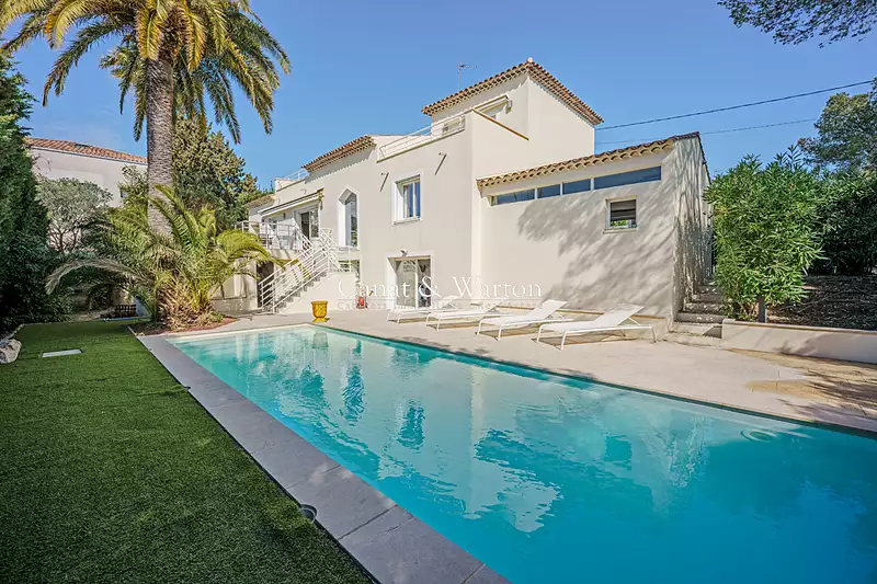 Située dans le très recherché quartier des Plaines, cette villa séduisante et parfaitement rénovée en 2000 offre un subtil équilibre entre charme et confort contemporain. Dès l'entrée, vous découvrirez de beaux volumes avec un triple séjour baigné de lumière ouvrant sur une vaste terrasse, une cuisine indépendante Leicht entièrement équipée accompagnée de sa buanderie, ainsi qu'une suite parentale disposant d'un dressing et d'une salle de bains avec douche. A l'étage, une spacieuse mezzanine pouvant faire office de bureau précède deux suites bénéficiant chacune de leur terrasse privative avec une agréable échappée mer. A l'extérieur, le jardin paysagé met en valeur une superbe piscine de 12 x 3,5 m avec plage, ainsi qu'un espace aménageable selon vos besoins , pool house, quatrième chambre ou atelier. Un grand garage, deux caves et deux stationnements sécurisés complètent ce bien rare. Une propriété idéale pour profiter d'un cadre de vie privilégié, à quelques minutes du port et des plages. Mickael MERESSE (EI) Agent Commercial - Numéro RSAC : 811 785 302 - Frejus.