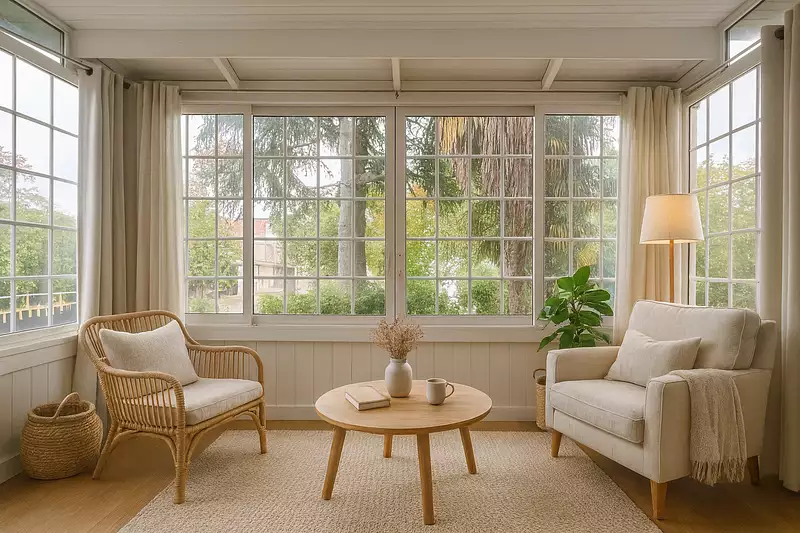 Dans le jardin : grande dépendance climatisée de type 2 pièces avec baie vitrée, salle de douche & WC — idéale bureau, invités ou activité calme.
