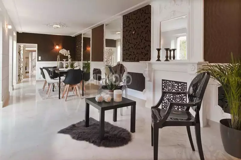 La salle à manger, spacieuse, permet d'accueillir de nombreux convives, et s'ouvre sur une cuisine haut de gamme équipée et aménagée. Son îlot central en marbre et sa double hotte en font un espace fonctionnel et raffiné.