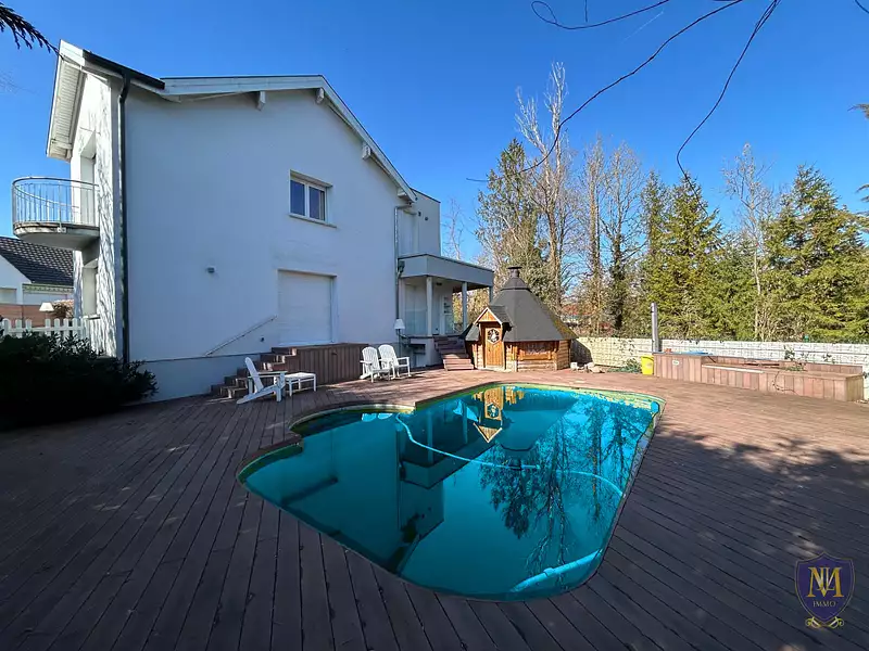 Située très au calme, belle et spacieuse maison année 2002 rénovée en 2015 de 236 m2 habitables comprenant : une entrée, une cuisine équipée ouverte sur un grand salon séjour avec poêle à bois donnant sur une terrasse, une chambre avec une salle d'eau équipée privative, un cellier, 3 chambres dont une parentale avec balcon + une salle de bains équipée avec baignoire balnéo/douche et une salle d'eau équipée séparée. Un sous sol complet composé d'un double garage, une grande cave, une buanderie et une chambre avec une salle d'eau équipée. À l'extérieur une piscine chauffée, un Kota-grill ainsi que 3 places de parking viennent compléter ce bien. Le tout sur un terrain de 7,14 ares.