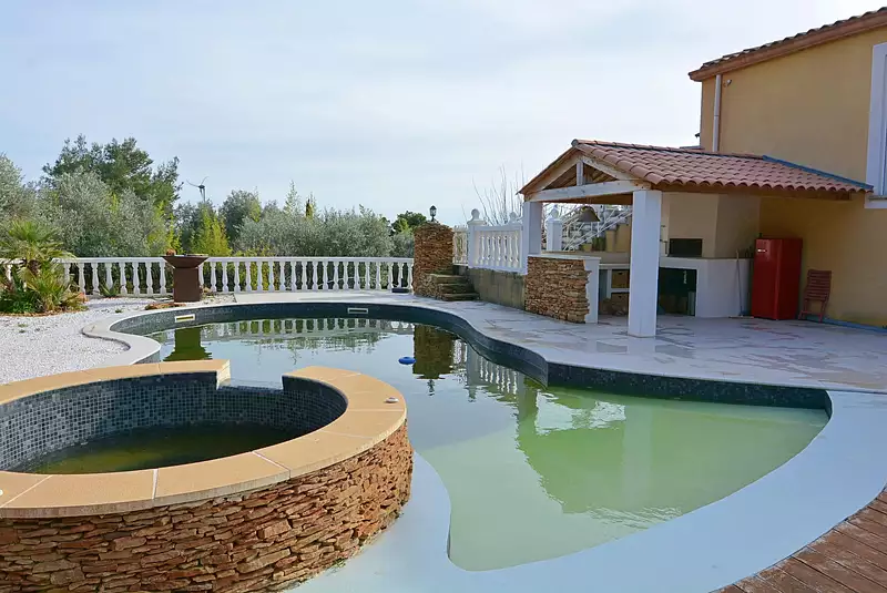 Pour compléter, une magnifique piscine et jacuzzi entourés d'une plage en pierre, entièrement sécurisée et fermée, avec sa cuisine d'été en béton ciré, et son four à pizza donnant à imaginer de longues soirées d'été.