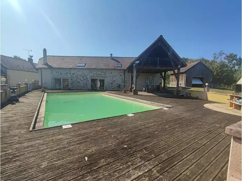 A visiter A LA LUCARNE DE L'IMMOBILIER vous propose cette magnifique propriété implantée sur 5977 M2 aux portes de Fresnay Sur Sarthe, des Alpes Mancelles et proche de l'autoroute A28. Maison de pierres en L très lumineuse entièrement restaurée de 238 m2 habitable avec piscine chauffée sécurisé (12x6). Le rez-de-chaussé vous offrant: entrée, cuisine aménagée équipée coin repas(27m2), grand salon(30m2), une chambre(19m2), CT avec douche WC, séjour-salon avec cheminée un bar(31m2), salle de jeux(14m2), cellier(12m2). A l'étage: palier dégagement desservant trois belles chambres(25-15-12m2) dont une avec balcon vue sur la piscine, grand dressing(17m2), bureau(8m2) CT douche WC, salle de bain baignoire double vasques WC(8m2). Toutes les menuiseries en PVC double vitrage et volets électriques. Terrain clos arboré, terrain de boules, verger, garage en annexe, local technique piscine, chaufferie fuel, très bon état général et différentes prestations de qualités. Le prix indiqué comprend les honoraires de négociation qui se montent à 5% TTC du prix affiché, ces honoraires sont à la charge exclusive de l'acquéreur. DPE: 171, soit D, GES: 42, soit D. Patrick LALLENEC, Agent Commercial immatriculé au RSAC de ALENCON sous le numéro 33914734000063 - A la lucarne de l'immobilier - Ref. 84431