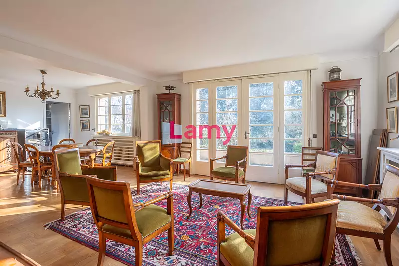 Vous bénéficierez des beaux volumes et de la clarté de ce très beau Pavillon 'maison de maîtres et ingénieurs des mines (années 1950)' et de son parc, dans ce quartier calme, verdoyant et résidentiel, proche Acacias maternité Monaco: Entrée sur hall avec vestiaire et sanitaires distribuant: bureau, salon séjour donnant sur terrasse, cuisine, salle à manger, à l'étage: pallier distribuant 4 chambres (dont une suite parentale et 3 avec cabinet de toilettes dans placard), salle de bain/douche, au second étage, une chambre et vaste grenier aménageable, au sous-sol complet chaufferie et caves, garage, parking, dépendance et parc...(chaudière 5 ans)... produit rare et exceptionnel en matériaux nobles. Nous consulter 03 27 41 13 56
