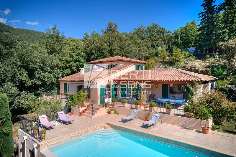 MAGAGNOSC (06520) A 20 minutes de Cannes Superbe villa avec vue panoramique, appartement indépendant et vaste domaine boisé Le groupe Berti and Sons vous propose, au coeur d'un domaine privé et sécurisé de seulement trois villas, cette magnifique propriété d'environ 240 m² habitables. Elle se compose : d'une habitation principale de 5 pièces, lumineuse et spacieuse, d'un grand appartement indépendant, idéal pour recevoir ou pour un projet locatif, de prestations haut de gamme : piscine 10x5, double garage, caves à vins. Nichée au sein d'une forêt privée de plus de 5.000 m², la propriété bénéficie d'un calme absolu, d'un ensoleillement optimal et d'un environnement rare, alliant nature et sérénité. Un bien d'exception, en très bon état général, offrant une vue imprenable sur les collines grassoises, à seulement 20 minutes de la Croisette. (6.38 % honoraires TTC à la charge de l'acquéreur.)