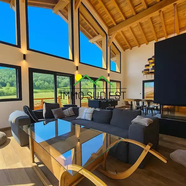 Vous apprécierez son immense pièce de vie, sublimée par de grandes baies vitrées et son toit cathédrale qui offrent une luminosité traversante et une vue imprenable sur le paysage montagnard.