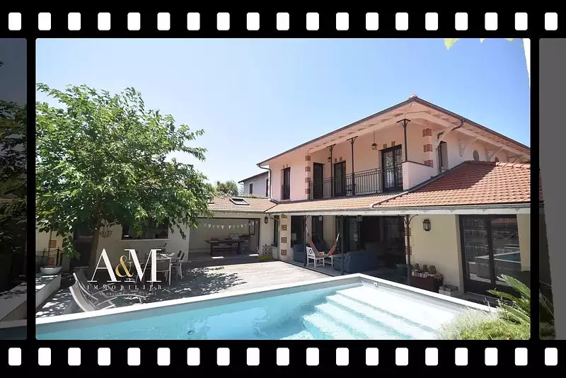 À l'extérieur, le terrain de 830 m², entièrement paysager et sans vis-à-vis, accueille une cuisine d'été parfaitement équipée, une piscine avec cascade, et de vastes terrasses pour des moments de détente en toute intimité.