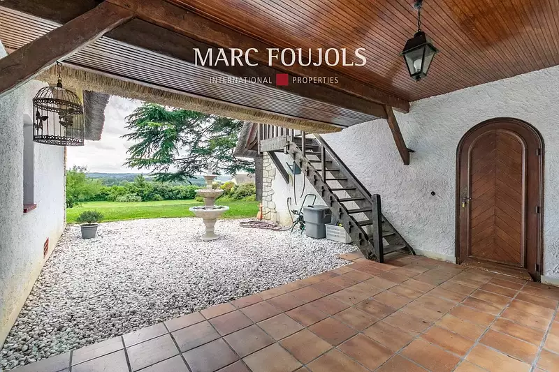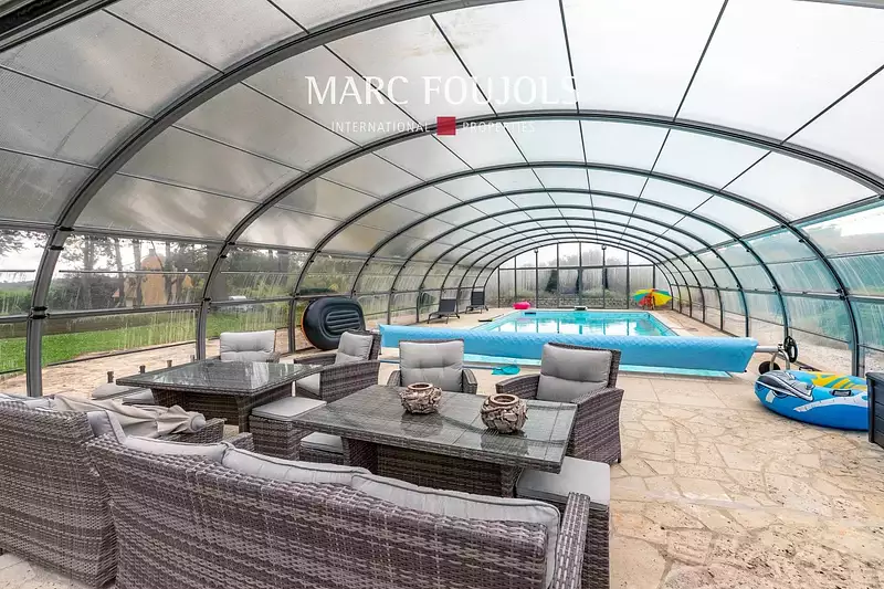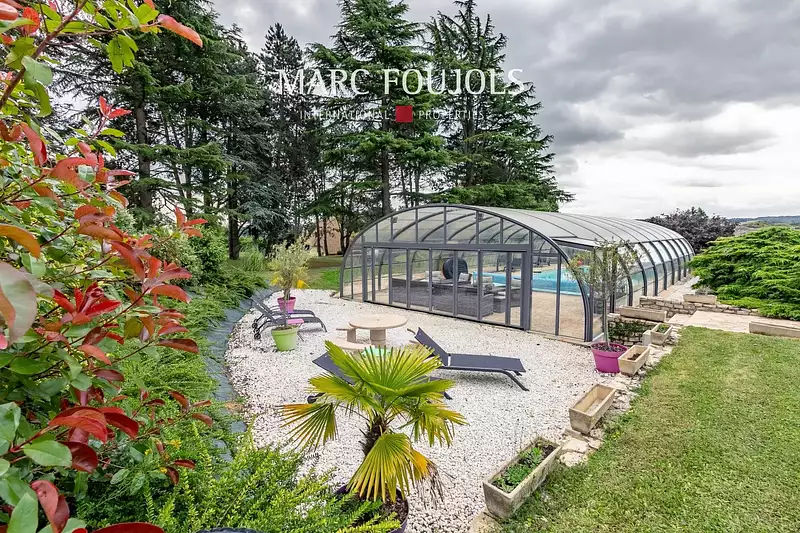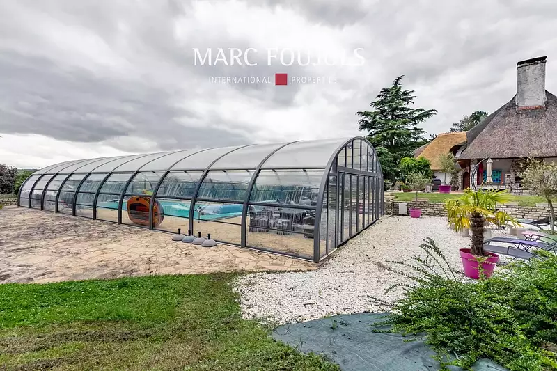 À l'extérieur, vous trouverez une piscine couverte et chauffée, un garage pour deux véhicules, et un studio de 21 m² à aménager. Une maison de gardien est également située à l'entrée de la propriété.