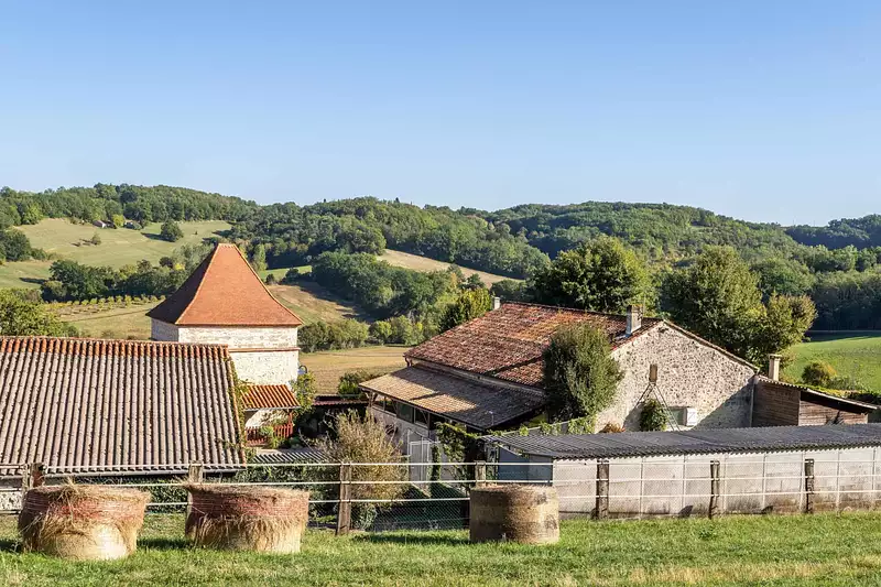 The stone property, in an elevated position, was formerly a stud and horse training farm, comprises of a c1900 stone house, pigeonnier and barn plus various outbuildings. The house has an open plan kitchen/living area with large beamed ceiling and fireplace leading to a large veranda, offering incredible far-reaching views across the gently rolling paddocks and countryside. There are 4 bedrooms, a bathroom, separate WC and storage and dressing room. The lower level offers a mudroom, another storage room and a veranda. The walls and ceilings are insulated, with double glazing and central heating (wood).