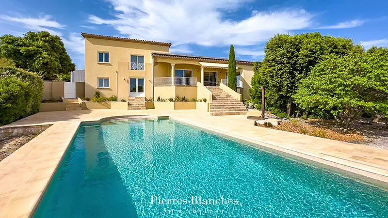 PIERRES-BLANCHES IMMOBILIER - L'EXPRESSION DU LUXE Montpellier - PBI Crush Aux portes de Montpellier, dans l'un des villages les plus prisés du nord languedocien, s'élève une propriété moderne de plus de 240 m², subtile alliance entre élégance architecturale et harmonie paysagère. Implantée au cœur d'un quartier résidentiel recherché, cette villa aux lignes résolument méditerranéennes cultive un art de vivre empreint de sérénité et de lumière. Édifiée sur deux niveaux, la maison a été pensée avec un souci constant du détail et de l'équilibre. Dès l'entrée, le vestibule nous guide vers un espace de réception lumineux, ouvert sur la nature par de larges baies vitrées qui prolongent le regard vers les collines et les forêts alentour. Le salon, spacieux et convivial, se prolonge vers une cuisine indépendante où la fonctionnalité s'allie à la convivialité, accueillant aisément une grande tablée familiale. La sphère privée du rez-de-chaussée abrite trois chambres baignées de lumière, desservies par une salle de bains aux lignes sobres et raffinées. En rez-de-jardin, un studio indépendant prolonge la maison. Idéal pour recevoir ou préserver l'intimité, il bénéficie d'un accès direct aux terrasses et à la piscine. Un bureau ainsi qu'un atelier de bricolage complètent ce bien, où chaque espace trouve naturellement sa vocation entre fonction et émotion. À l'extérieur, le jardin paysager, suspendu entre ciel et garrigue, s'impose comme un belvédère sur la vallée de l'Hérault. Les essences méditerranéennes s'y mêlent dans une symphonie de verts profonds, et lorsque le soleil culmine, la piscine à débordement de 10 mètres devient un miroir d'azur où se reflète la douceur du Sud. Les terrasses ombragées, organisées autour de plusieurs espaces lounge, offrent des moments de détente privilégiés, d'où l'on savoure le calme et la beauté immobile du paysage. Aux premiers jours du printemps, la végétation diffuse son ombre bienfaisante, comme une invitation au lâcher-prise. Les plus : Double garage - piscine au sel par électrolyse - atelier de bricolage - installation photovoltaïque de 9 kWc (22 panneaux garantis 40 ans) - prise de recharge pour véhicule électrique - proximité immédiate des commerces, écoles et transports. Notre Avis - Un Point d'Évasion® Au cœur d'un écosystème préservé, cette villa incarne une architecture habitée, entre géométrie des sommets et souffle des horizons. Un lieu rare, pensé pour s'évader du quotidien sans jamais s'éloigner de l'essentiel : la lumière, la nature, la paix. "Une Vision Authentique et Contemporaine de l'Immobilier de Luxe." Franck Ballester ® TOUTE INSPIRATION, MODIFICATION, REPRODUCTION EST INTERDIT - REGISTERED TRADEMARK Dossier sur références Contact +33 (0)4 67 70 07 87