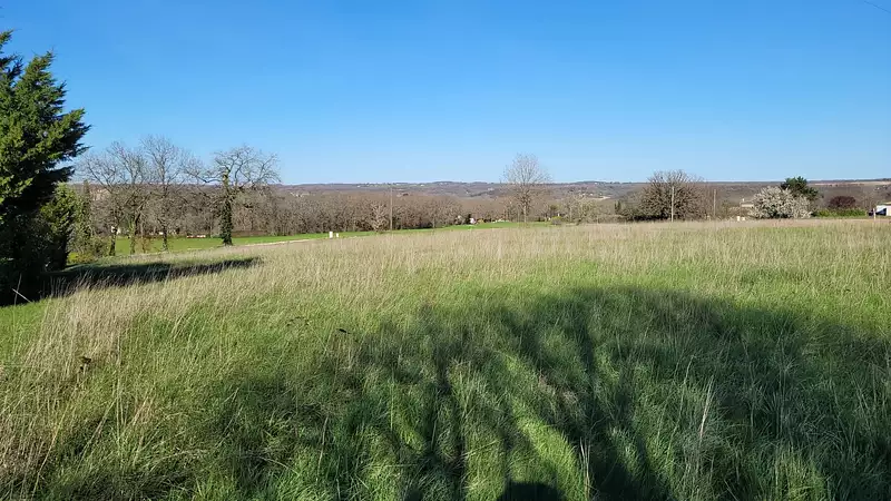 Terrain constructible de 2 422 m² viabilisé à seulement 200 m du centre du village de Roquecor, avec belle vue dégagée et accès facile par chemin rural