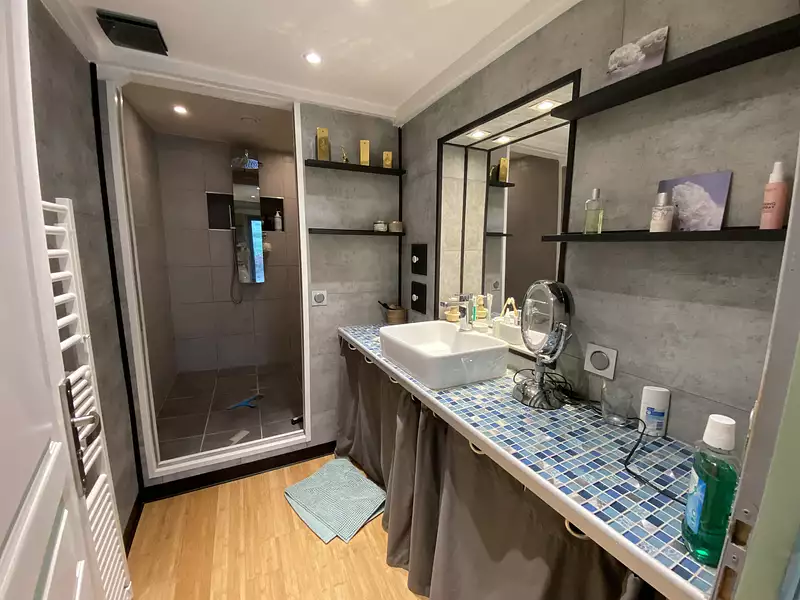 À l’étage, un palier dessert deux chambres dont une suite parentale avec salle d’eau, WC et dressing. Le dernier niveau offre trois chambres avec rangements ainsi qu’une salle de bains avec WC.