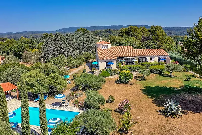 EN EXCLUSIVITE SOGIP. Flayosc Proche du Village Belle propriété avec 4 chambres et dépendances, piscine sur 4700 m2 de terrain clos. Idéal chambres d'hôtes. Cette propriété est constituée de plain-pied : d'une belle pièce de réception avec cheminée 52m2, cuisine à vivre de 22m2, cellier, Garage 18m2 et bureau de 18m2. Une chambre de 15m2 avec sa salle d'eau privative, Un appartement avec séjour/coin cuisine 17m2 et sa chambre de 16m2, dégagement et salle d'eau, terrasse privative. Un autre appartement avec séjour/coin cuisine de 17m2, dégagement et sa chambre de 12m2 avec salle d'eau. A l'étage la master suite de 15m2 avec dressing de 13m2 et salle de bain. La villa est entièrement climatisée. Espace détente avec superbe Pool house et cuisine d'été équipée de 40m2, Piscine 10x5 et ses plages autour. Un parc paysager clos de plus de 4000 m2 . Au calme, à 2 pas du village, magnifique vue dégagée . A découvrir ! SOGIP à Flayosc depuis 40 ans. Caroline et Bruno à votre écoute !