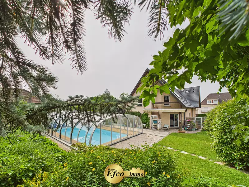 En exclusivité ! Sur la colline du rebberg de Dornach avec accès direct à l'autoroute vers l'Allemagne et la Suisse, à 10mn à pieds de la gare pour Bâle, à 30mn de l'aèroport, nous vous proposons cette magnifique villa de 243m2 dans un écrin de verdure avec piscine couverte chauffée sur 14,46 ares arborés et fleuris.