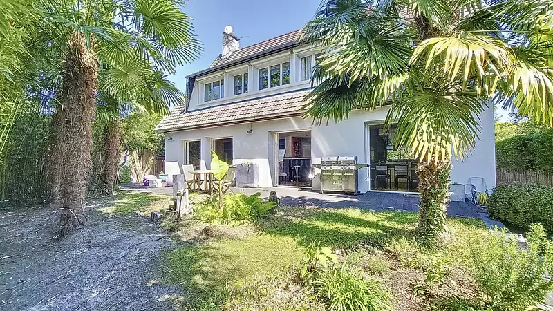 Patio et abris de jardin cadastrés. Prestations de qualité : cuisine Häcker, parquets en bois exotique, double vitrage à galandage, éclairages extérieurs et arrosage automatique.