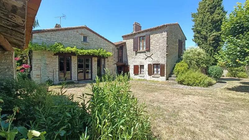 GOURDON IMMOBILIER vous propose à la vente, EN EXCLUSIVITÉ, sur la commune de La Grimaudière, à 10 kilomètres de Mirebeau, dans un environnement calme et agréable, dans un écrin de verdure, une maison ancienne en pierre avec piscine, environ 245 m2 habitables, comprenant :