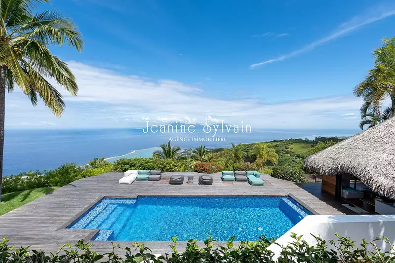 Découvrez cette magnifique villa, un véritable havre de paix niché au coeur d'un jardin tropical de 2700 m² offrant une vue panoramique époustouflante sur le lagon et Moorea.