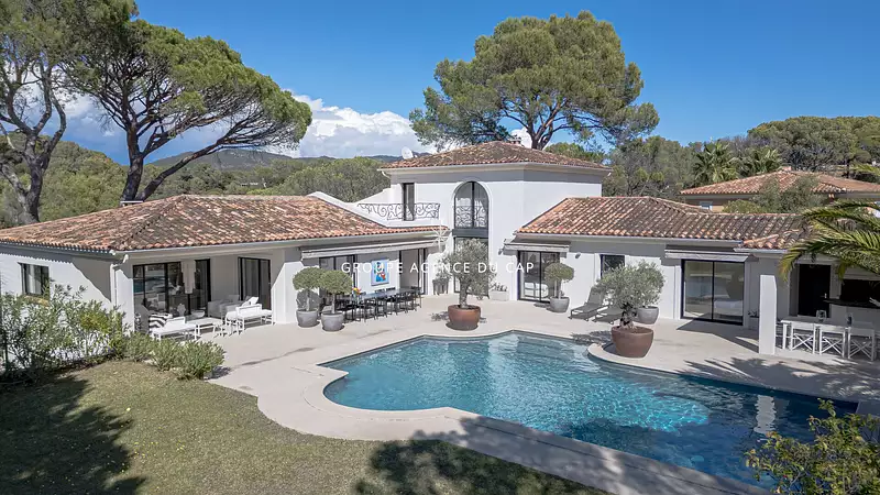 Valescure, dans un domaine privé résidentiel, à pied des commerces, belle villa dominante sur 1900 m² de jardin paysagé avec piscine, 5 chambres, 3 salles de bains et 1 salle d'eau. Garage double appartement indépendant, parfait état.