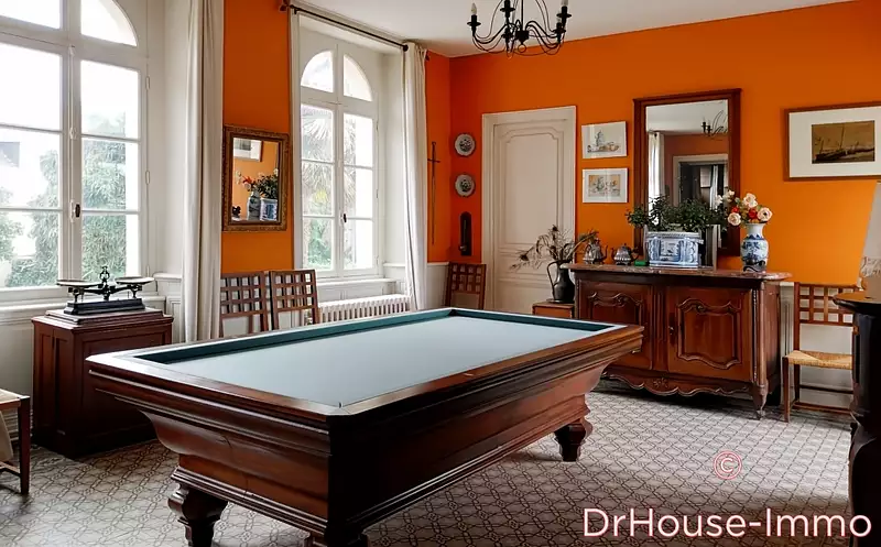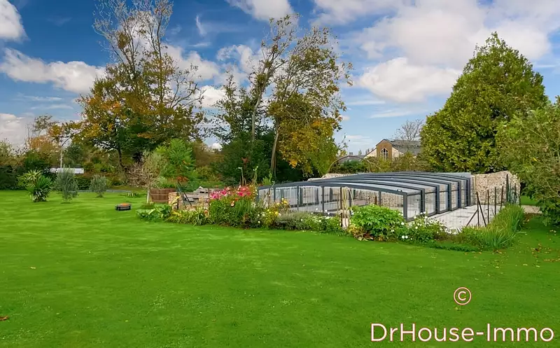 La grande maison cossue en pierre offre une façade régulière et harmonieuse sur la rue. Un petit jardin arboré la sépare de la rue et ne laisse pas deviner la profondeur du bâti, les nombreux bâtiments qui modulent les jardins en autant d'espaces privés et charmants, ni la piscine couverte au milieu du parc. Fidèle à l'architecture bourgeoise, les pièces de réception en enfilade occupent le rez-de-chaussée avec quelques passages secrets" de service qui feront le bonheur des enfants : les pièces sont hautes de plafond, très lumineuses car elles sont également ouvertes sur le jardin. Le dernier salon aménagé en bureau peut devenir une chambre de plain-pied.