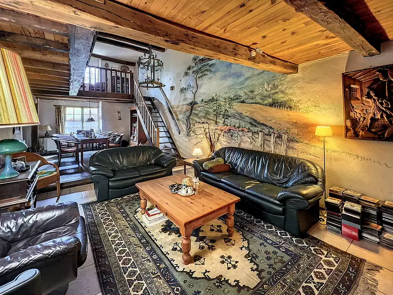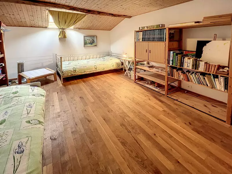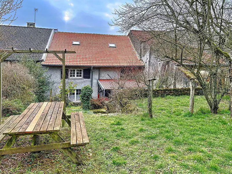 Malgré la paisible impression d'isolement, la maison est mitoyenne, vous bénéficiez donc de la sécurité de voisins à proximité. Un petit garage est inclus, offrant un espace protégé pour votre véhicule ainsi qu'une possibilité de rangement supplémentaire.