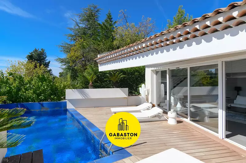Côté extérieur, un jardin parfaitement entretenu, avec un espace barbecue, un salon et pergola bioclimatique. Pour le stationnement, un garage double se trouve au pied de la villa avec une aire de retournement.