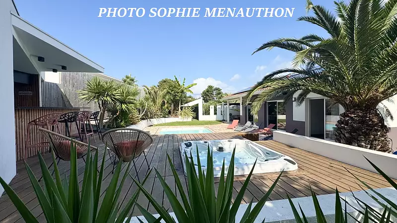 Situation idéale, entre plages et bourg, à proximité des pistes cyclables, au calme et sans vis-à-vis, dans un quartier résidentiel recherché de Labenne. JOLIE VILLA D'ARCHITECTE DE TYPE 9 PIECES DE 247 M2 DONT UN APPARTEMENT DE TYPE 4 PIECES DE 102 M2 SUR UNE PARCELLE DE 1000 M2 AVEC PISCINE, SPA, POOL HOUSE, DOUBLE GARAGE DE 45M2. La maison, d'une surface de 145 m2, se compose d'une belle pièce de vie lumineuse de 67 m2 avec un insert et une cuisine entièrement aménagée et équipée. De larges baies vitrées s'ouvrent sur un espace extérieur soigneusement pensé. Elle comprend également 4 chambres, dont une spacieuse suite parentale, une salle d'eau, une salle de bains, 2 toilettes et une buanderie/cellier. En rez-de-jardin, l'appartement de type 4 pièces de 102 m2, classé en résidence de tourisme, comprend une entrée indépendante, une pièce de vie avec cuisine aménagée et équipée, 3 chambres, une salle d'eau, des toilettes et une terrasse. Trés belles prestations: cuisine eggersmann, domotique pour volets roulants et lumières, spa 6 places, piscine chauffée 9X4, pool house entièrement équipé, terrasse couverte, arrosage automatique par forage, portail électrique, aspiration centralisée, panneaux photovoltaiques, et système Bose intégré. Ce bien est idéal pour une résidence principale et/ou un investissement immobilier locatif. (diagnostics en cours). Contactez Séverine ETCHEGARAY Tél : 06 75 49 61 04 ou Sophie MENAUTHON Tél : 06 25 42 67 68 EQUINOXES IMMOBILIER Agence specialisée en biens de Prestige Landes et Pays Basque Plus d'informations (réf. 4000924819) Prix TTC et Honoraires à charge vendeur TTC AGENT COMMERCIAL Les informations sur les risques auxquels ce bien est exposé sont disponibles sur le site Géorisques : georisques.gouv.fr