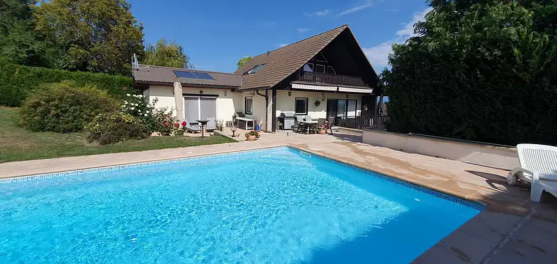 SAUVERNY 01220, dans lotissement calme, et résidentiel, au fond d’une impasse, très belle villa individuelle type T7 (6 chambres) de 248m2 sur un terrain de 1441m2 clos, arboré et avec une piscine. Elle est composée : d'une cuisine équipée ouverte sur un espace repas, un séjour salle à manger avec accès au jardin ainsi qu’au jardin avec la piscine, une chambre vaste suite parentale avec une salle d'eau privative, son wc et son dressing, une autre chambre et une salle de bains avec WC. Au niveau supérieur : trois chambres dont une un balcon et une salle d'eau avec WC. Au sous-sol complet : une autre chambre, un dressing, une buanderie, un atelier, un local technique, une salle d'eau avec un WC et un garage double. Dans la cour extérieure : 2 places de parkings. Très belle vue Jura, Alpes et Mont Blanc ! Un chalet jardin agrémente le jardin ainsi qu’une magnifique piscine de 12M X 5 M.