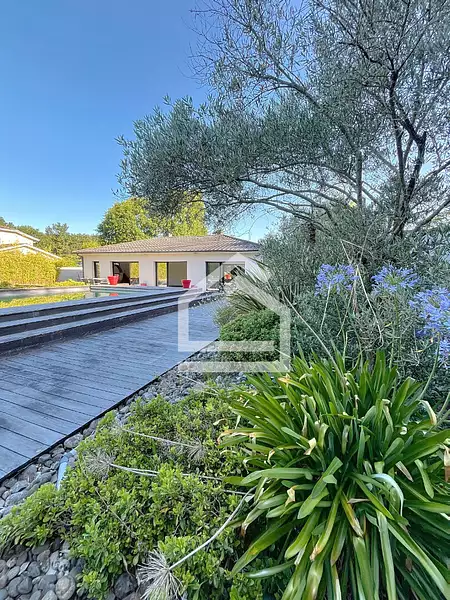 L'Agence CADRE D'ENVIES Blanquefort, vous présente en exclusivité cette villa aux prestations rares, située dans un environnement préservé et calme. Cette somptueuse villa de plain-pied s'inscrit dans un style résolument élégant, où les lignes épurées, les volumes généreux et les prestations haut de gamme s'harmonisent avec subtilité. Implantée sur un terrain de 1325 m², elle s'organise autour d'un patio central de 26 m², véritable coeur de la maison, agrémenté d'un jacuzzi et baigné de lumière naturelle. La Maison de Standing développe une surface habitable de 180 m2 environ et s'articule autour d'une pièce de vie de près de 80 m², aux volumes spectaculaires, comprenant un salon avec cheminée, un espace salle à manger et une cuisine haut de gamme en open-space. En se rendant vers le coin nuit, nous découvrons tout d'abord 3 chambres avec placards, une salle de bain complète avec une douche et une baignoire. Nous terminons par la suite parentale, avec son dressing et sa salle d'eau. Depuis cette suite, une large ouverture vitrée dévoile une vue imprenable et un accès direct vers la piscine intérieure, créant une atmosphère unique face à ce véritable miroir d'eau apaisant. A l'abri des regards, et orientée plein sud, une pièce de détente de 75m2 baignée de lumière abrite une grande piscine intérieure de 25 m² (10 m x 2,5 m), idéale pour la nage, offrant un espace de relaxation intime et exclusif pour une expérience de bien-être en toutes saisons. Les extérieurs, soigneusement aménagés, offrent un jardin fleuri et paysager aux essences variées, véritable écrin de verdure autour de la maison. Une vaste terrasse en bois exotique encadre avec élégance la piscine extérieure. L'ensemble crée un espace convivial, propice à la détente. A l'avant de ce bien, un parking pour plusieurs voitures ainsi que 2 garages viennent compléter cette jolie maison. Dans une commune prisée de la région Bordelaise, à seulement quelques minutes des commodités, des écoles, cette propriété ravira les amateurs de lieux uniques, désireux de conjuguer confort moderne, élégance et tranquillité. Seule une visite vous permettra d'apprécier pleinement l'harmonie des volumes, la qualité des prestations et l'atmosphère unique de cette villa. DPE B / GES A Prix Honoraires d'Agence inclus de 790 000 euros Les honoraires d'agence sont de 4,89% TTC à la charge de l'acquéreur. Le prix net vendeur est de 753 098 euros Contact : MICHAËL DE CARVALHO au 0680602761 Les informations sur les risques auxquels ce bien est exposé sont disponibles sur demande ou sur le site Géorisques : www.georisques.gouv.fr (4.90 % honoraires TTC à la charge de l'acquéreur.)