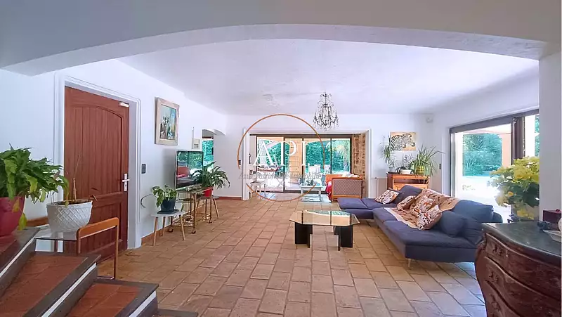 - d'un vaste séjour/ salle à manger très lumineux de plus de 55m2 s'ouvrant, avec des baies vitrées, sur la grande terrasse couverte et la piscine.
