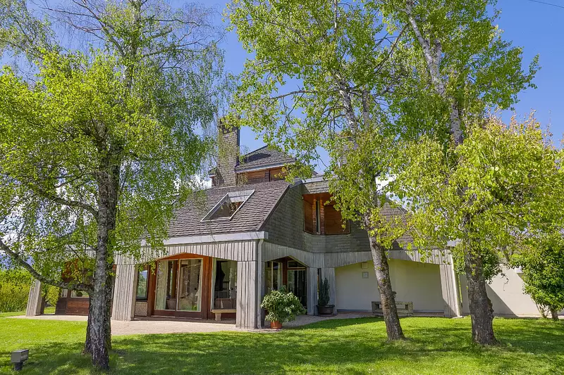 - CHEZ NG IMMO - Venez découvrir avec Jean-Marie aux portes de Genève dans un havre de paix cette demeure unique en son genre offrant une vue panoramique et majestueuse montagnes. Construite sur les hauteurs de Fillinges, d'un vaste terrain de plus de 4197 m2, orné d'arbres splendides et de terres agricoles, cette demeure est nichée dans un coin de sérénité. Cette maison a été construite par un architecte réputé offrant une superficie de plus de 250m2. Le rez-de-chaussée de cette maison est remarquable car il est baigné de lumière naturelle par toutes ces ouvertures. Il comprend un superbe double séjour, un coin salon orné d'une magnifique cheminée en forme de tuyau inversée, une cuisine séparée, une buanderie, des toilettes et une chambre. Toutes les pièces du rez donnent accès à une splendide terrasse exposée sud offrant une vue dégagée. Au premier niveau, vous trouverez six chambres, chacune équipée de son propre balcon, ainsi que trois salles de bains. Enfin, au dernier étage de la maison se présente un grand salon avec un haut plafond cathédrale, offrant une vue impressionnante sur les montagnes. De plus, la maison comprend un sous-sol entièrement équipé, doté de plusieurs caves, un espace spacieux pouvant être utilisé comme salle de sport, salle de jeux ou home cinéma. Pour accueillir les véhicules, un garage double est disponible, ainsi qu'un bel espace extérieur. La maison dispose d'un très joli jardin, arboré et sans vis-à-vis, au cœur de la nature et à quelques pas de la forêt. Idéal pour les moments de détente en famille!