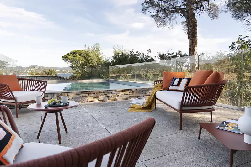 Au premier étage, la pièce principale de plus de 90 m2 s’ouvre sur une large terrasse exposée sud. Prolongée par une piscine à débordement, elle offre une vue spectaculaire sur la baie de Saint-Tropez, un véritable tableau vivant à chaque heure du jour.