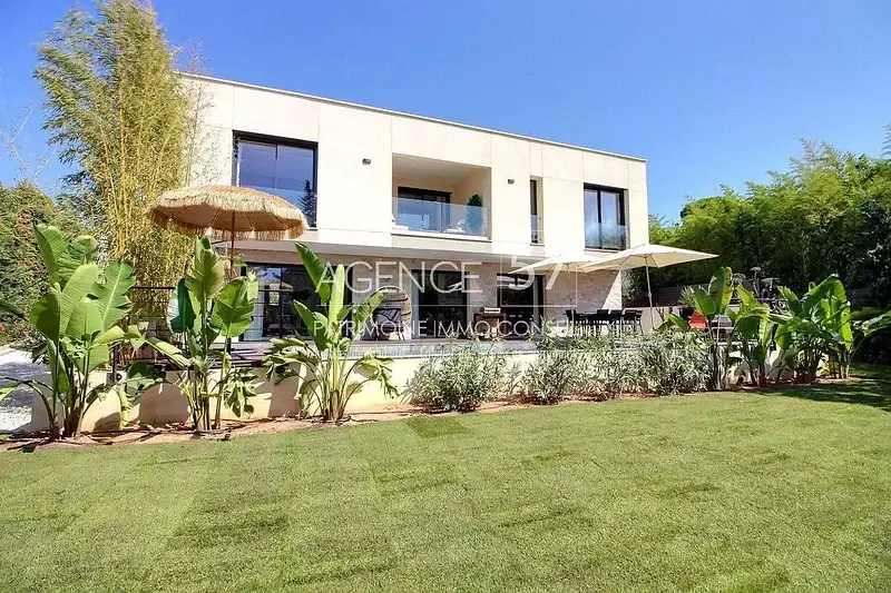 Dans un des plus beaux quartiers de Mougins, à 5mn en voiture du Vieux Mougins, et à 5mn en voiture de Mougins school, dans un univers charmant et résidentiel, au calme absolu, magnifique villa contemporaine neuve. Sur un terrain plat exposé sud de 1060m², belle villa d'architecte de 250m² composée d'un immense séjour avec coin repas et cuisine américaine équipée donnant sur grande terrasse en teck et piscine, une chambre en suite avec salle de bain/Wc, une chambre en suite avec sddouche/wc au rez de chaussée. A l'étage magnifique chambre de maître de plus de 50m² avec dressing et sdbain/wc et deux autres chambres supplémentaires en suite également avec sddouche/wc. Au total donc
