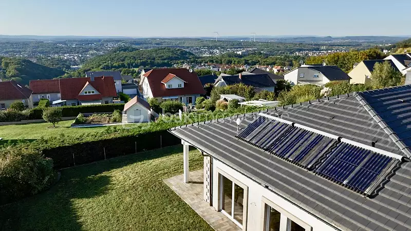 Hoch oben auf den Anhöhen von Œting gelegen, bietet diese 2001 fertiggestellte Architektenvilla ein einzigartiges Wohnambiente, das Eleganz, Helligkeit und einen außergewöhnlichen Panoramablick vereint. Die mit edlen Materialien und hochwertiger Ausstattung gestaltete Villa verfügt über eine Wohnfläche von ca. 250 m², davon knapp 190 m² ebenerdig. Das Wohnambiente ist ruhig und eindrucksvoll.
