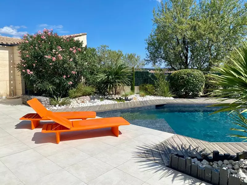 Pézenas 5 min Située à 10 minutes , dans le village de Caux, cette magnifique villa T5 en R+1 de 250 m² habitables sur un terrain de 854 m² offre un style contemporain et des prestations luxueuses.