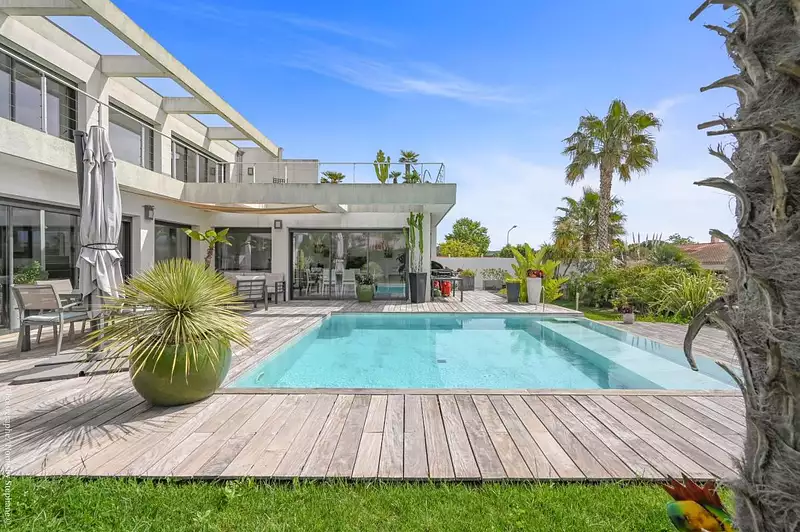 L'extérieur est un véritable havre de détente, avec sa piscine à débordement, son spa intégré et ses espaces verts parfaitement entretenus.