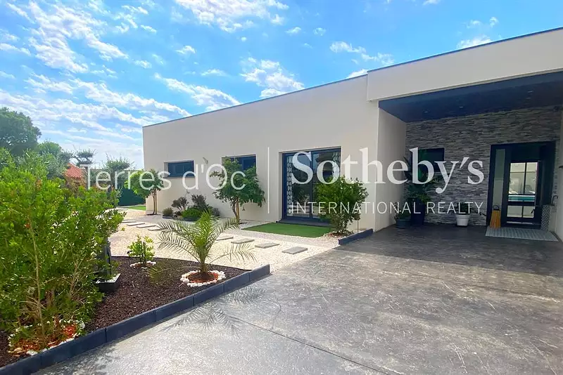 Splendide villa contemporaine de plain pied d'environ 425m² sur 1049m² clos et ne nécessitant aucun entretien. Jouxtant un luxueux espace piscine (environ 90m²), ses 250 m² de surface habitable déploient une vaste pièce à vivre d’environ 100m², 3 immenses suites et un bureau (ou chambre). Elle est parfaitement équipée en matériel haut-de gamme et son grand garage d’environ 85m², sa buanderie et son atelier accroissent encore son confort… Proche de Thuir, rare dans ce secteur apprécié de l’Ouest de Perpignan.
