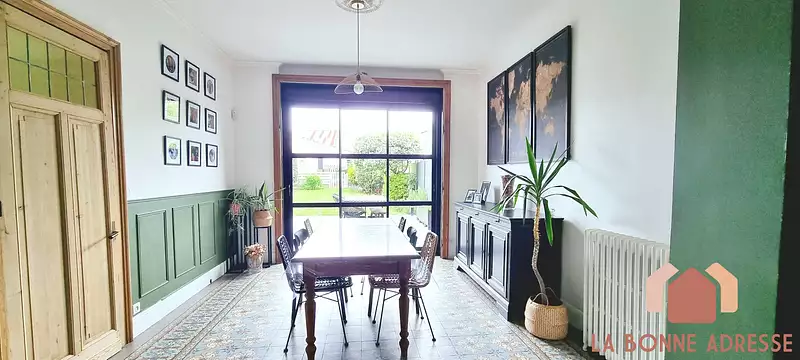 En rentrant, on découvre un hall d'entrée desservant les différentes pièces de vie de la maison. On découvre un salon de 16m2 très cosy avec son parquet chevron et sa belle cheminée d'époque fonctionnelle. Ensuite, on retrouve l'espace salle à manger de 34m2 donnant accès d'une part à la cuisine et d'autre part au jardin. On poursuit la visite par une cuisine dinatoire de 24m2 complètement équipée avec son piano de cuisson + hotte de la marque Godin. Un cellier fonctionnel est attenant à la cuisine.