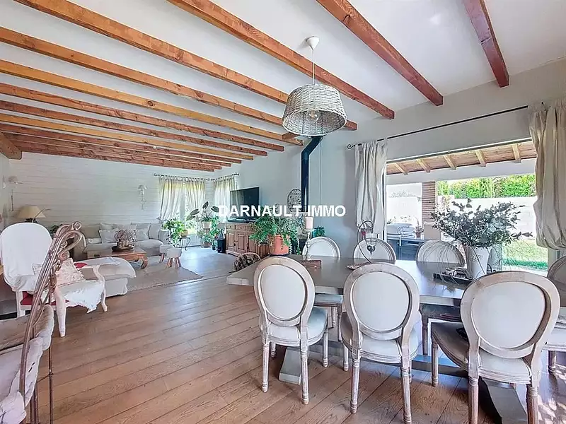 La maison se compose d'une belle entrée qui distribue une GRANDE PIECE DE VIE avec cuisine ouverte aménagée et équipée (hotte professionnelle, piano de cuisine, double évier, etc...). Une grande buanderie/lingerie est à côté de la cuisine.