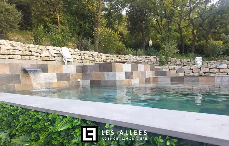 Très belle piscine en Pierre de Bali avec un espace enfants.